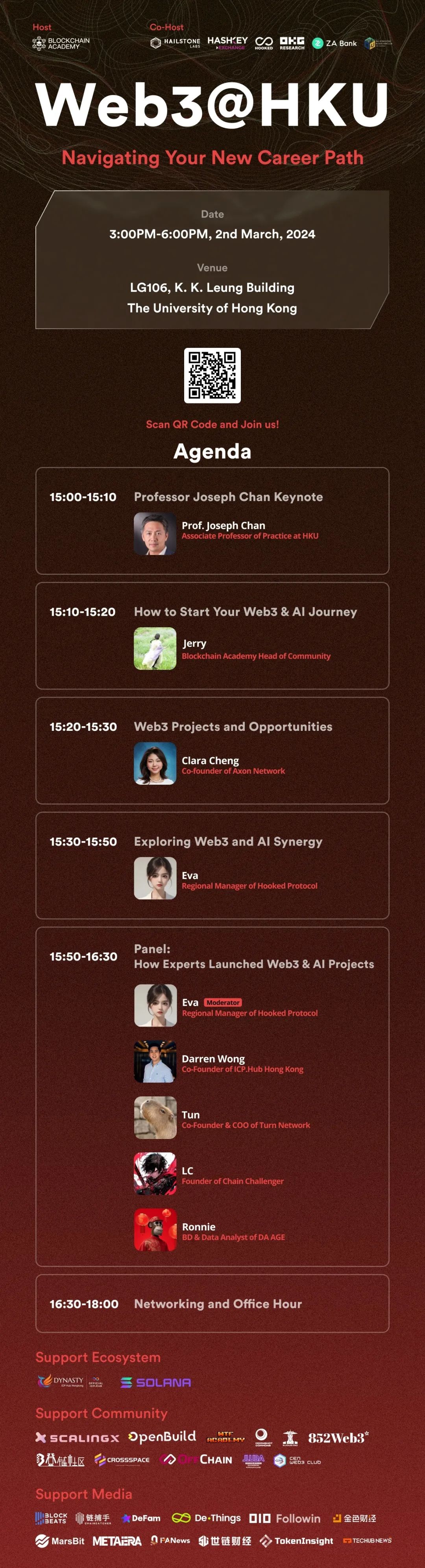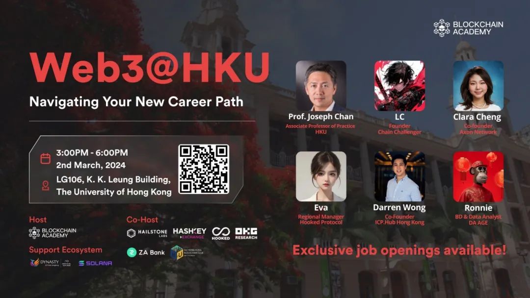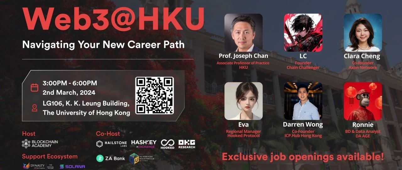 由 Blockchain Academy 主办,Hailstone Labs、HashKey Exchange、Hooked Protocol、OKG Research、ZA Bank 和 0xU Blockchain Club 协办的 Web3@Campus 系列活动即将来到香港大学!快来探索 Web3 与 AI 的崭新职业路向,与项目创始人们畅谈行业趋势;还有更多工作机会等你拿下,助你在 Web3 中迈出职业的第一步。