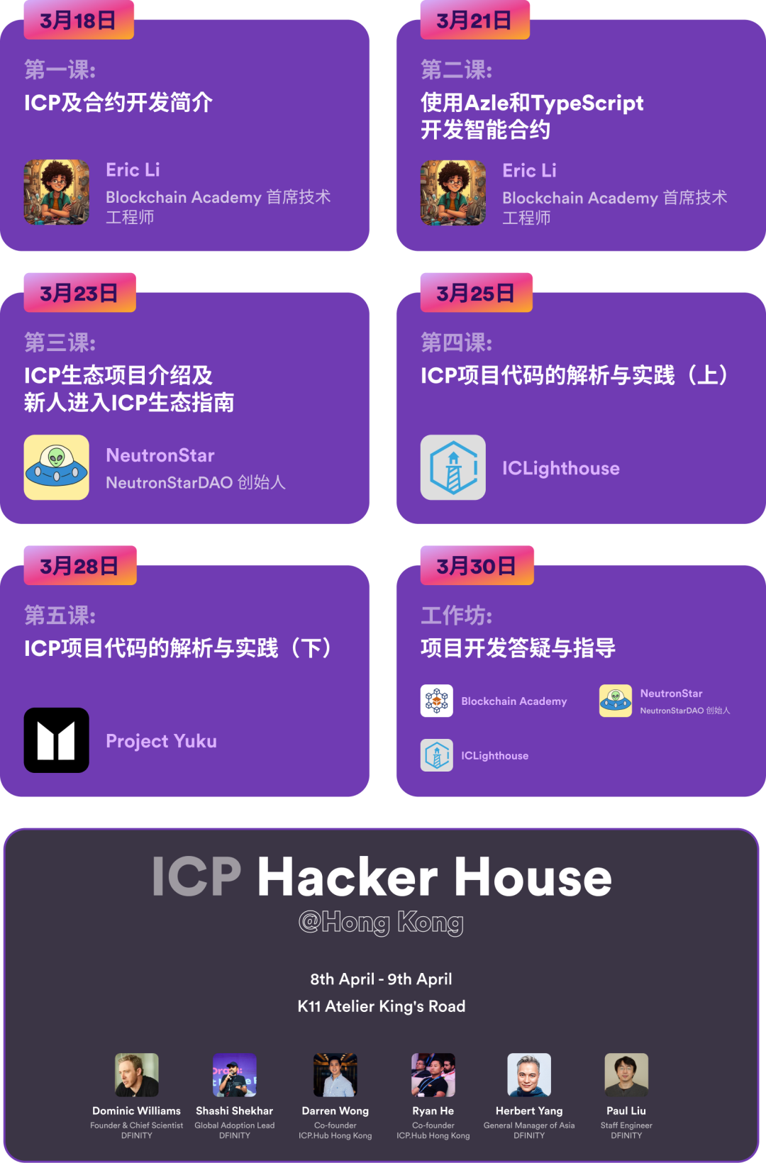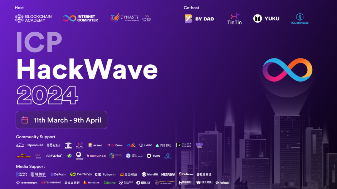 Blockchain Academy 与 Internet Computer 合作举办 ICP HackWave 2024,为开发者提供一系列 ICP 生态开发课程,包括线上的 bootcamp 课程五节课程,加上线下的 hackerhouse 活动。