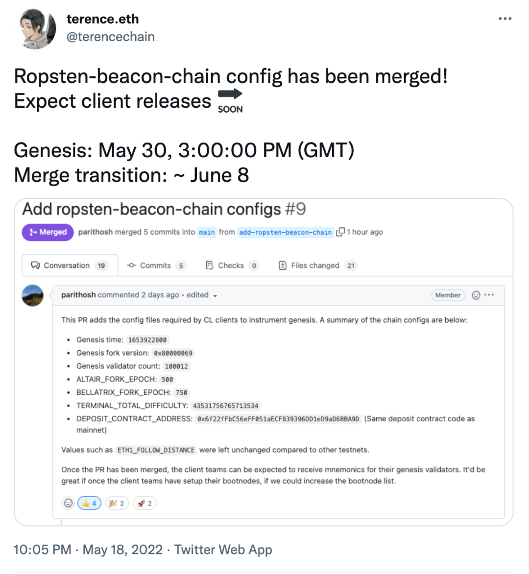 今天最主要的话题就是「合并(Merge)」,「合并」指的是从原来的 PoW 共识机制,转向 PoS 共识机制。自以太坊项目开始以来,我们几乎一直在致力于两者的转换。在「合并」上,我们已经花费了 7 年时间。到现在,所有的付出都逐渐有了收获,我们已经在一周前,在以太坊测试网络 Ropsten 上进行了「合并」。预计 6 月 8 日,我们将会完成,如果测试网络上一切顺利的话,我们将会在这个夏天,在主网上进行「合并」。这是我们接下来的主要行动,也是我们目前做过的最大行动,这将为之后任何链上应用的「合并」打下基础。