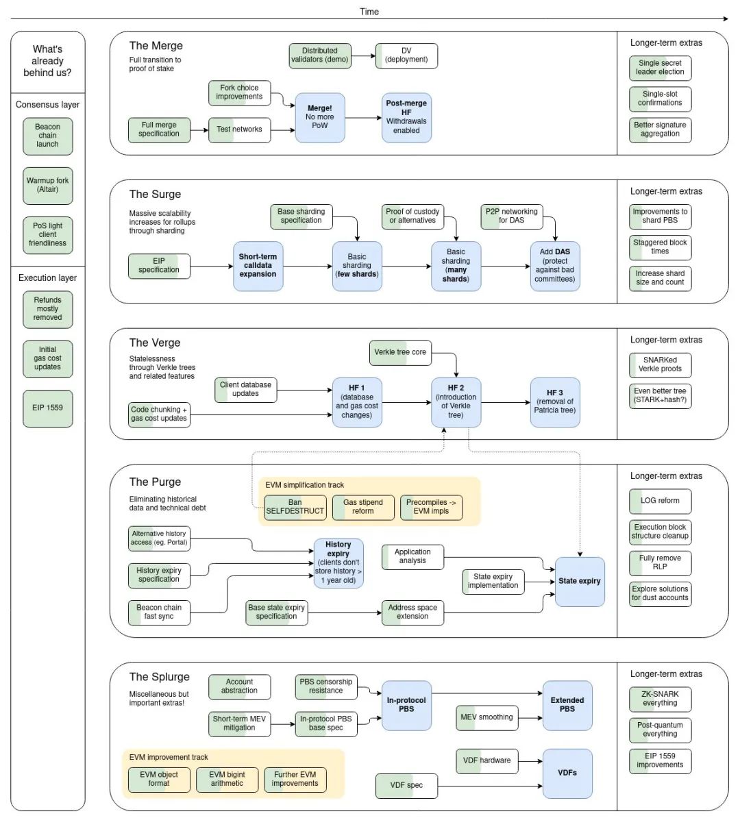 关于这点,我在 5 月份的时候就发表了一篇关于协议更新的论文进行说明。这些事情早就已经在以太坊的开发者中存在了,信标链和 PoS 已经在他们手中开发出了一年半了。信标链中其实已经有可能少量用户了。EIP-1559 现在也已经运行了。接下来的几年,还有很多新的改动会发生,为了方便大家理解我把它们分为五个部分来说,分别是 Merge、Surge、Verge、Purge 和 Splurge。