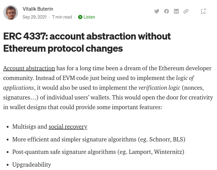更高效、更简单的签名算法,帮助你的账户抵御黑客的攻击,让账户本身具有可升级性。为了实现这些,我们开发出了 ERC 4337 协议。ERC 4337 不是 EIP,它是 ERC,这意味着这不需要去提供技术的基本原理和技术规范。实际上,现在已经可以使用 ERC 4337 来创建账户发送交易了,并且有一个开发人员社区已经在研究 ERC 4337 。期待他们能更快地完善 ERC 4337,你们作为开发者和用户也可以一起加入其中。