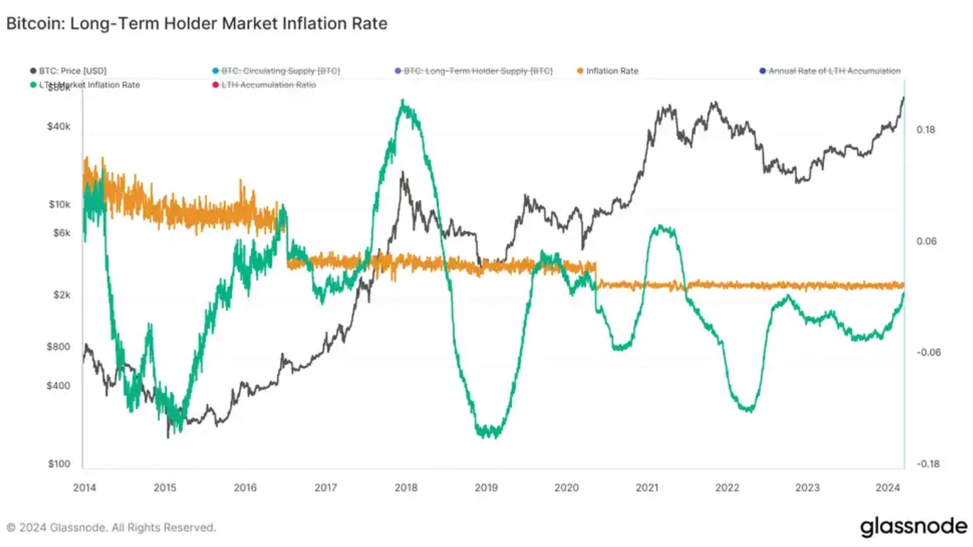 为了说明 LTH 在比特币市场供应动态中的作用,Glassnode 的分析师提出了长期持有者市场通胀率这一指标。它显示了相对于每日矿工发行量,长期持有者积累或分配比特币的年化比率。该比率有助于识别净积累期(长期持有者有效地将比特币从市场中移除)和净分配期(长期持有者增加了市场的卖方压力)。