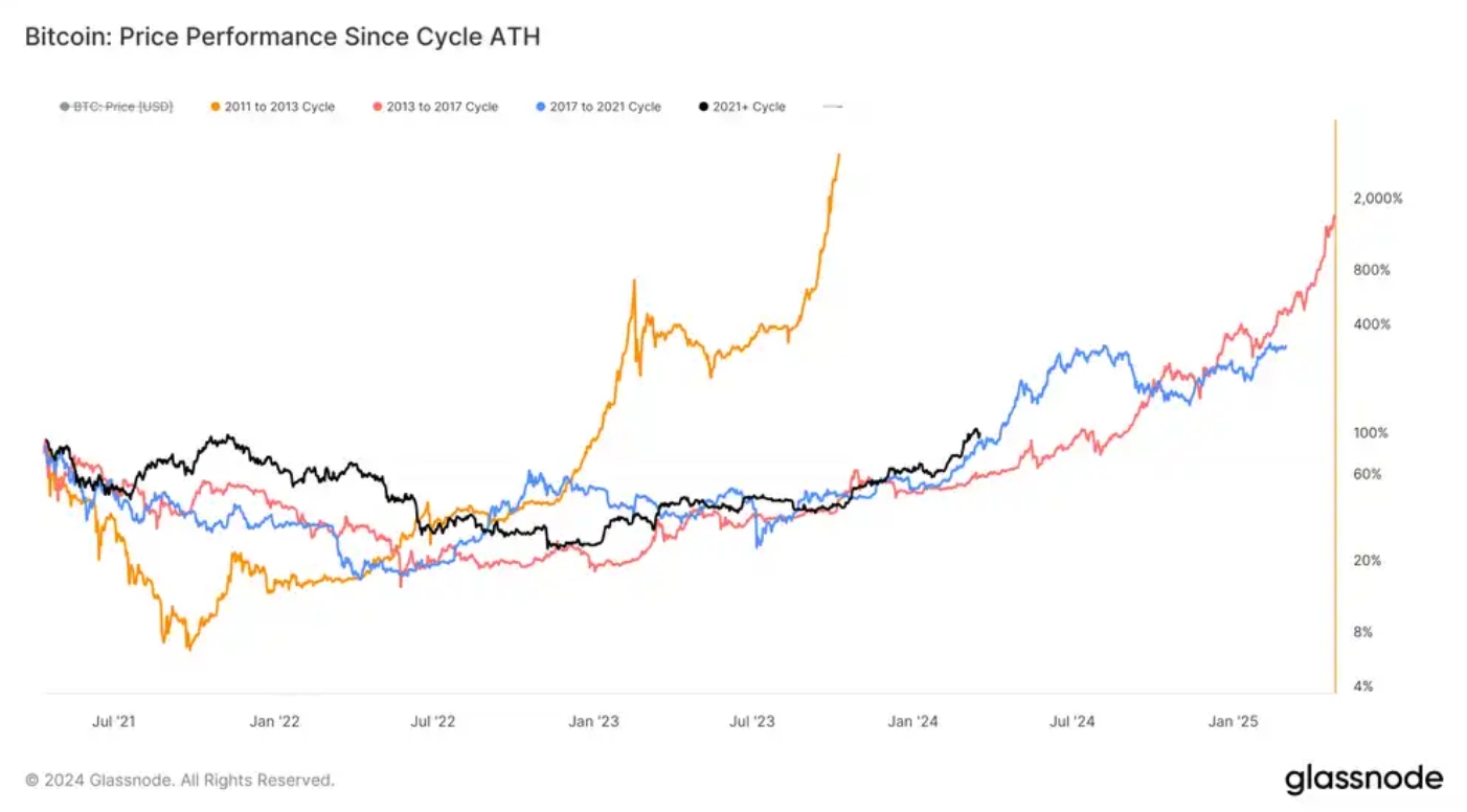 现在,以 2021 年 4 月作为前一个牛市的高点,可以看到当前周期很好地符合历史规范。这暗示尽管在减半前就已经突破了前一个 ATH,牛市可能仍将持续更长时间。
