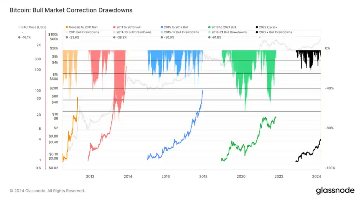 在评估当前周期与历史规范和趋势之间的差异,以及考虑到增强交易策略的视角时,监控「牛市校正回撤」指标也可能是实际的。这一指标反映了在持续的牛市中,价格回撤的深度和频率。