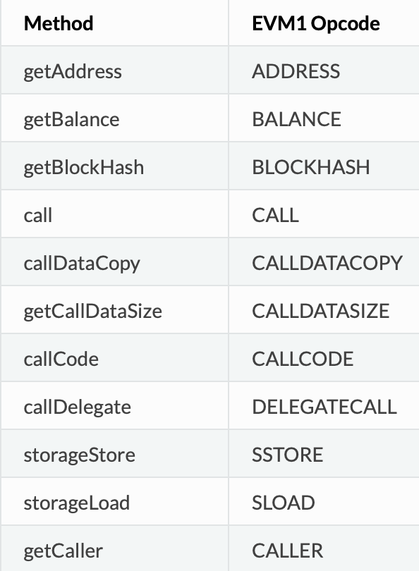 以下就是部分EEI中的方法和当前EVM opcode的一一对应关系: