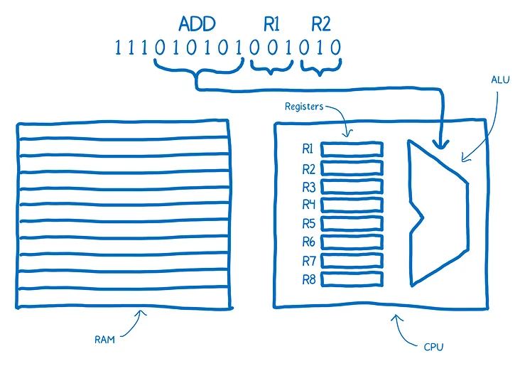 CPU真正负责计算和逻辑判断的是算数逻辑单元(ALU),指令被拆分为Operand(操作数)和Operation Code(操作码),前者指明操作对象的地址(也就是寄存器的地址),后者告诉CPU需要对Operand执行什么操作。