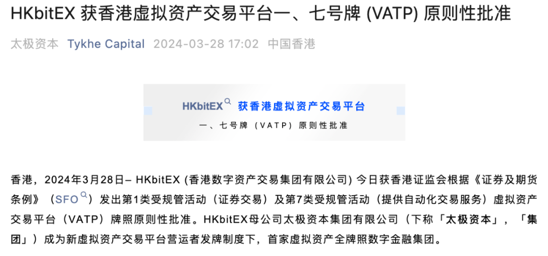 2024 年 3 月 28 日,HKbitEX,中文名香港数字资产交易集团有限公司,获香港证监会根据《证券及期货条例》发出第 1 类受规管活动(证券交易)及第 7 类受规管活动(提供自动化交易服务)虚拟资产交易平台(VATP)牌照原则性批准。此前,OSL、Hashkey 于2023 年 8 月 3 日对外宣布,获得证监会批准完成牌照升级,可以面向零售客户提供虚拟资产交易服务;2023 年 8 月 11 日,HKVAX 获香港证监会颁发原则上批准通知书,可进行第 1 类及第 7 类受规管活动(虚拟资产 1&7 号牌)。HKbitEX 成为香港第四家获证监会原则性批准的虚拟资产交易平台。同时,HKbitEX 母公司太极资本集团有限公司,成为新虚拟资产交易平台营运者发牌制度下,首家虚拟资产全牌照数字金融集团。太极资本 Tykhe Capital
