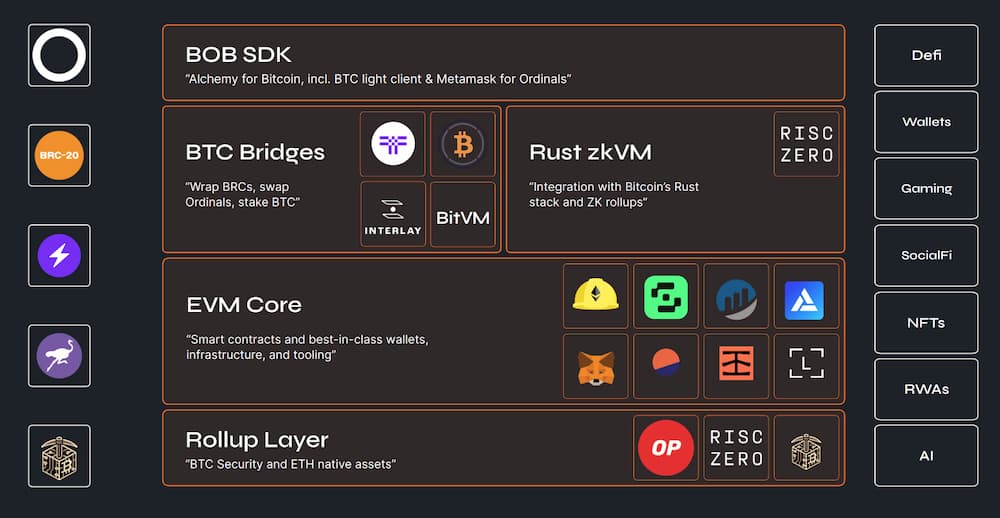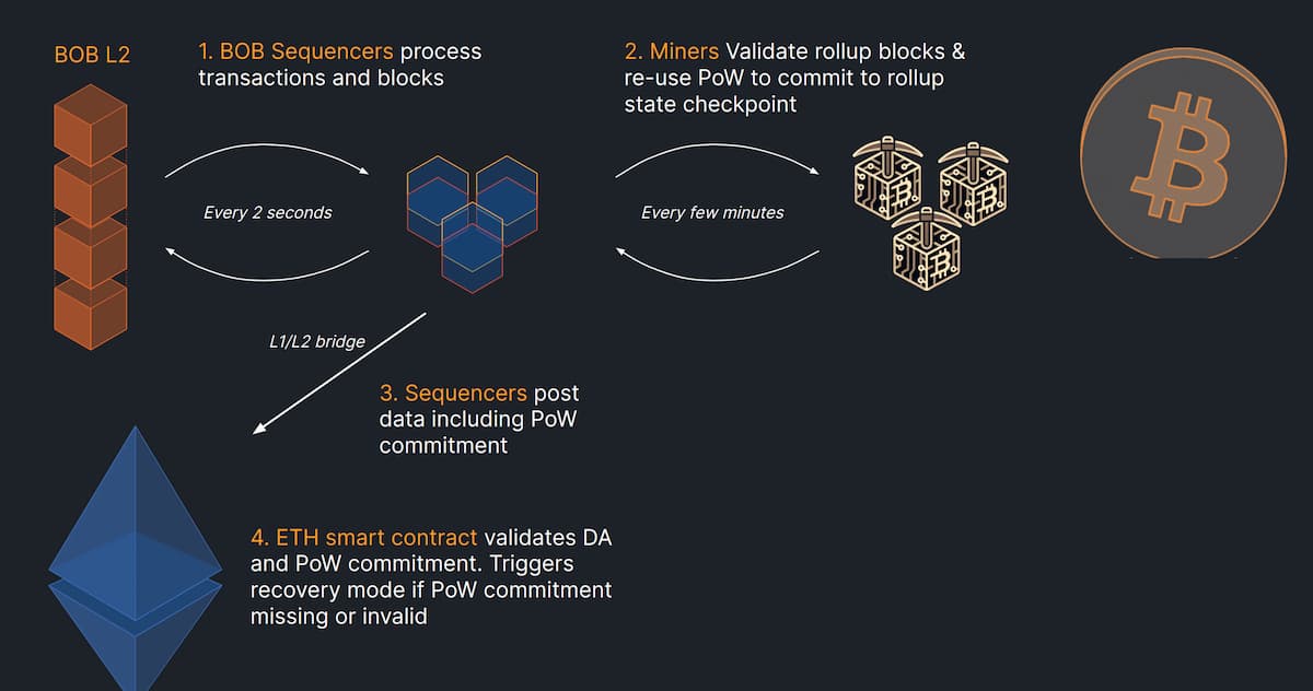 最初,BOB 在 OP 堆栈上启动,可以通过合并挖矿协议(比特币重质押)继承比特币的安全性,其最终目标是直接在比特币 L1 上结算,之后可能会通过 ZK Rollups 进行全状态验证。