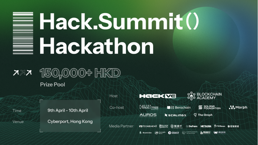由 HackVC、Blockchain Academy 主办,RockTree Capital、Berachain、Solana Foundation、Morph、ScalingX、Auros 和 The Graph 联合主办的 Hack. Summit () Hackathon 将于 4 月 9 日至 4 月 10 日在香港数码港举行,旨在聚集全球优秀的区块链开发者,目前已有 30+ 团队报名,竞逐逾 15 万港币奖池。