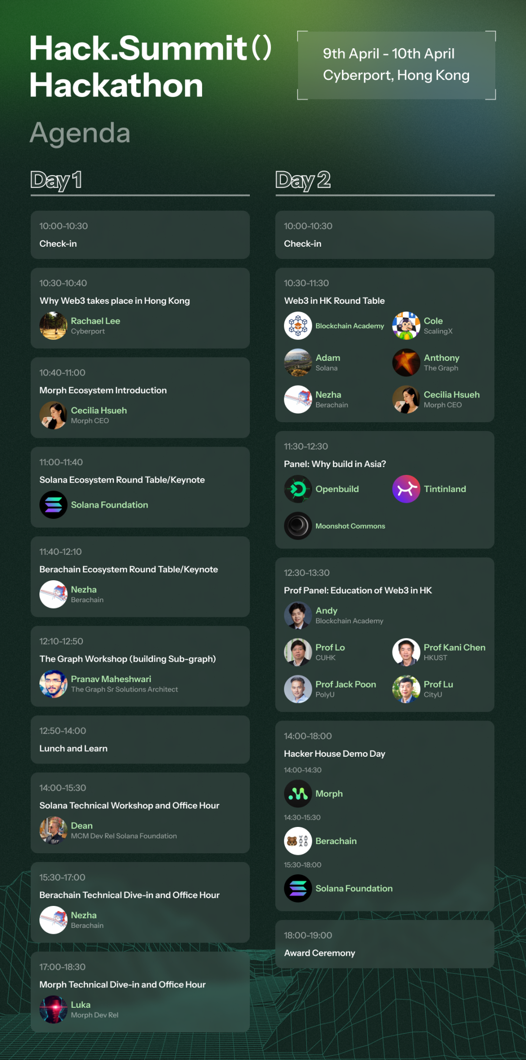 而本次线下黑客松中除了精彩的项目展示环节及来自各大公链的技术分享外,这次活动的嘉宾还包括香港数码港金融科技高级经理李懿政 (Rachel Lee)、香港中文大学教授劳维信、香港科技大学教授陈卡你、香港理工大学教授潘释正、香港城市大学教授陆志聪等,为我们带来关于香港 Web3 产业不同面向的讨论及分享。以下是两天会议的详细议程: