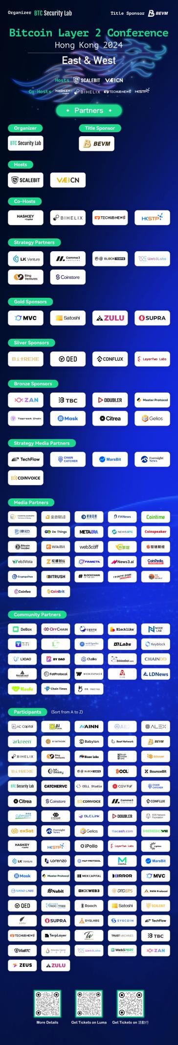 本次峰会邀请到东方与西方重点关注 Bitcoin Layer 2 的资本方、项目方、安全机构、技术社区、媒体以及周边资源等齐聚一堂。旨在集合多方力量,共同打造一场面向全球的 Bitcoin Layer 2 知识盛会。峰会获得了以下生态伙伴鼎力支持: