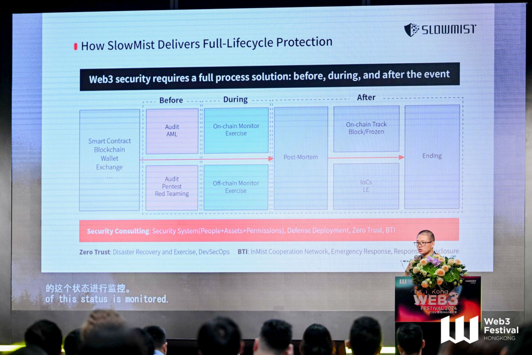 紧接着,在慢雾 (SlowMist) 安全审计组组长 Thinking 的《Web3 Security: Full Lifecycle Protection》主题演讲中,正式开启了“Security Afternoon”。Thinking 的演讲从香港加密货币合规牌照申请及必要性开始,延伸到安全审计以及 AML/CFT 的重要性,最后提出了一整套包括事前事中事后完整闭环的威胁防御解决方案。