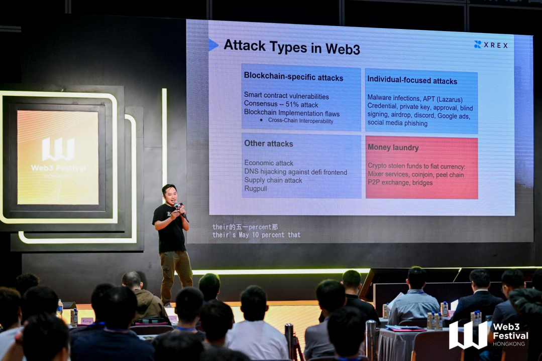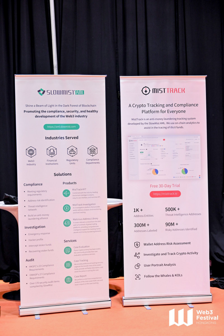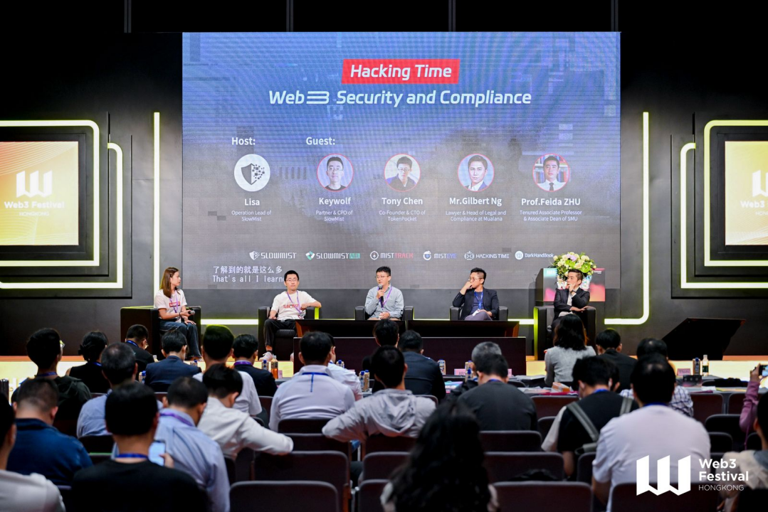 随后,现场舞台上进行了一场非常有意义的圆桌讨论。本场圆桌由慢雾 (SlowMist) 的 Operation Lead Lisa 发起提问,有幸邀请到了来自不同领域的 4 位专家对相关安全与合规问题进行解答,嘉宾包括慢雾 (SlowMist) 合伙人兼 CPO Keywolf,TokenPocket Co-Founder 兼 CTO Tony Chen,Mualana 法律合规主管吴律师以及新加坡管理大学 (SMU) 终身副教授兼副院长朱飞达教授。在这场圆桌对话中,主持人针对每位嘉宾的专业领域提出了一系列问题:Keywolf 从安全攻击事件以及链上追踪分析的角度,为观众解答了当下区块链面临的主要安全挑战,同时以实例向大家介绍了链上反洗钱的流程。Tony 从钱包项目方的角度出发,为用户介绍了钱包赛道常见的安全问题,并提出 TokenPocket 的防御机制与解决这些安全问题的方案。吴律师向现场观众深度解读了反洗钱的重要性,并表示今年香港反洗钱政策应注意关键词“OTC”、“散户交易”。最后,朱飞达教授从自己的教育与学术经验出发,阐述了当下如形式化验证、AI 技术的意义,并分享了对 Web3 新人入圈或培养的见解。