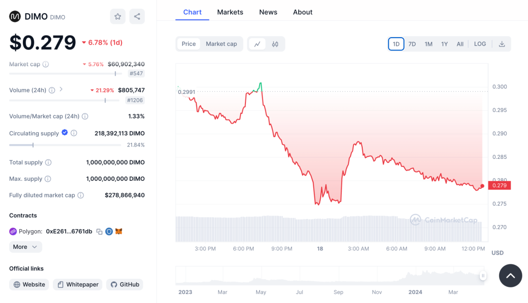 截止目前,DIMO 的价格为 $0.279,最近一周内下跌了 24.27%。市值约为 $60,902,340,位于排行榜的第 547 位。24 小时交易量约为 $805,747,交易量与市值的比为 1.33%,市场活跃率较低。最近一周,DIMO 的价格经历了一段下跌趋势,随后出现了一些波动。整体上,价格呈现出下跌趋势,这可能表明市场对该代币的信心减少或者市场整体状况不佳。