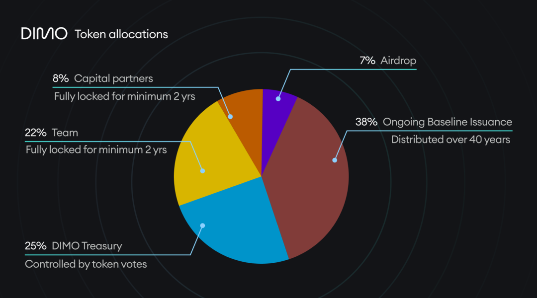 从 DIMO 代币的分配来看,团队占据了 22% 的比例,这些代币被锁定两年,确保团队对项目的长期承诺。资本合作伙伴获得了 8% 的份额,也同样锁定了两年。DIMO Treasury 控制着 25% 的代币,由社区投票决定其使用。最大的一块是持续的基线发行,占了 38%,这些代币将在接下来的 40 年里逐渐释放,目的是为了项目的长期生态系统激励和健康发展。此外,7% 的代币通过空投分配给社区,以促进用户参与和扩大采纳率。