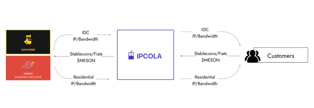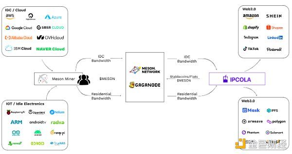 商业模式,Meson Network 通过产品如 Gateway X 和 Gaga Node 整合带宽资源,并通过 IP Cola 等产品进行商业变现,以奖励那些贡献带宽的节点。