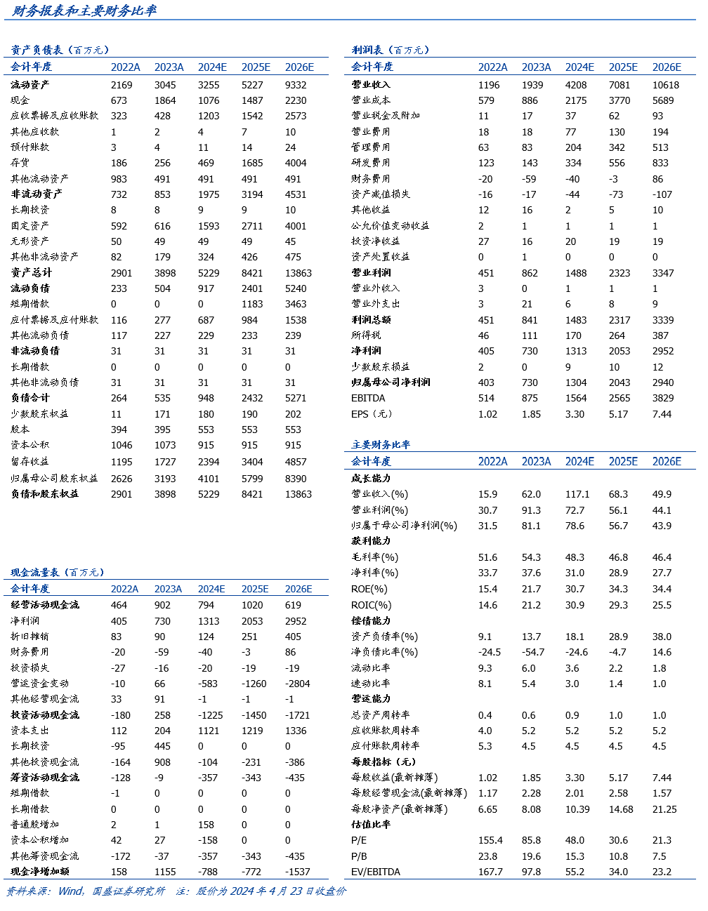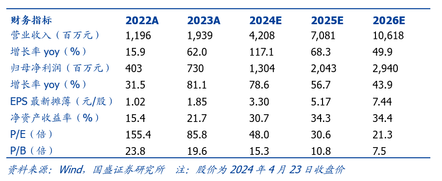 投资建议:我们预计公司 2024-2026 年营业收入分别为 42、71、106 亿元,归母净利润分别为 13、20、29 亿元,当前股价对应 PE 分别为 48、31、21 倍,考虑 AI 带来的光通信高景气度,以及公司优秀的质地,维持“买入”评级。