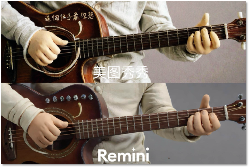 为同一张弹吉他的手部照片做黏土特效,Remini 生成的手部肌肉、手指甲都较为立体分明,而美图生成的颜色清亮,但手部总有一种糊感,细看部分手指还出现了畸形。