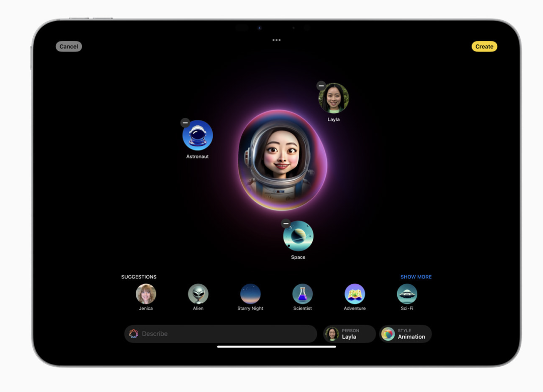 用户也可以使用 Image Playground,选择主题、服装、配饰和地点等一系列概念;输入描述来定义图像;从他们的个人照片库中选择某个人包含在他们的图像中;并选择他们最喜欢的风格。