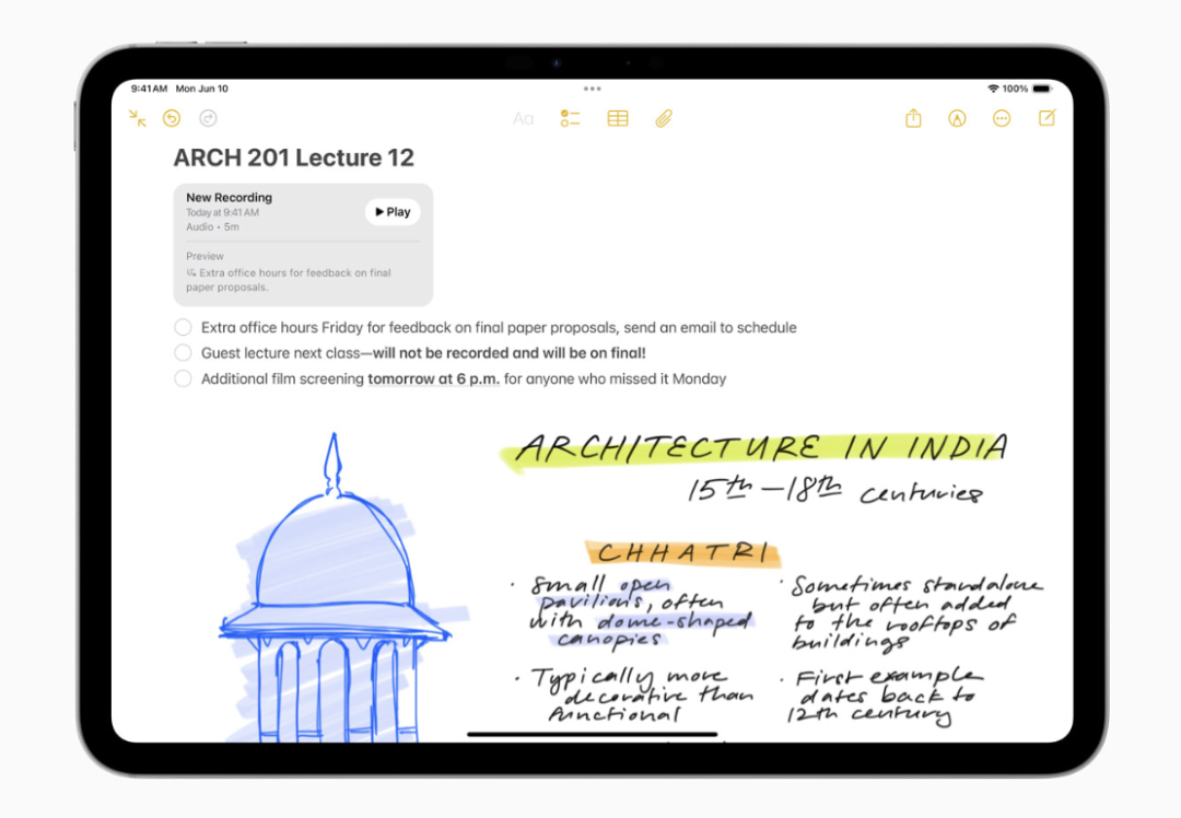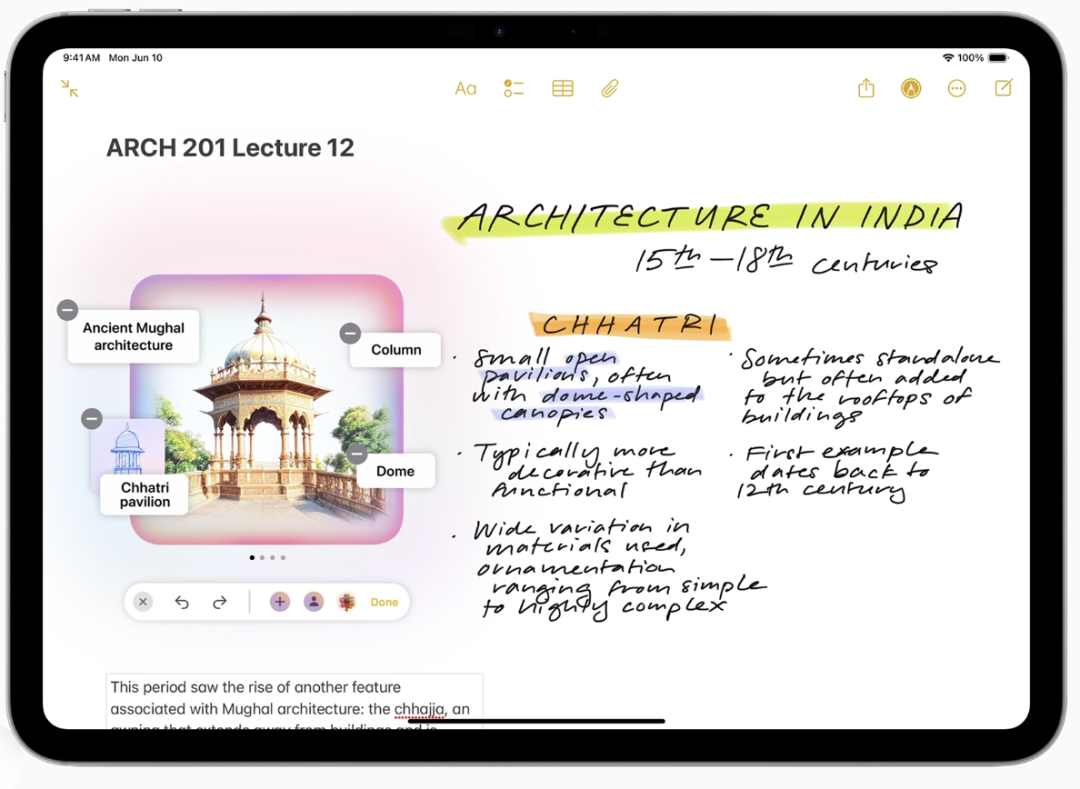 在备忘录中,用户可以通过 Apple Pencil 工具面板中的新 Image Wand 访问 Image Playground,让笔记更具视觉吸引力。草图可以变成赏心悦目的图像,用户甚至可以选择空白处,利用周围区域的上下文来创建图像。