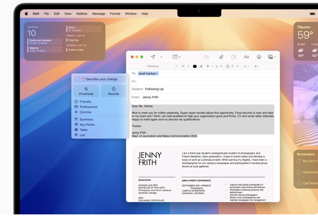 凭借 iOS 18、iPadOS 18 和 macOS Sequoia 内置的全新全系统写作工具,用户几乎可以在任何写作的地方重写、校对和总结文本,包括邮件、备忘录、Pages 和第三方应用。