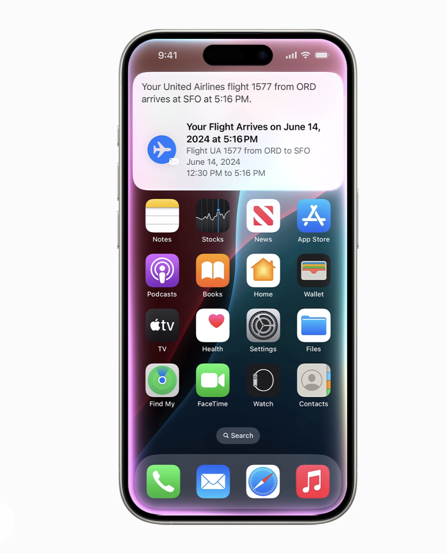Siri 还能够提供针对用户及其设备上的信息量身定制的智能。例如,用户可以说“播放 Jamie 推荐的播客”,Siri 就会找到并播放该集,而用户无需记住它是在短信还是电子邮件中提及的。或者他们可以问“妈妈的航班什么时候降落?”,Siri 会找到航班详细信息并将其与实时航班跟踪进行交叉引用,以提供到达时间。