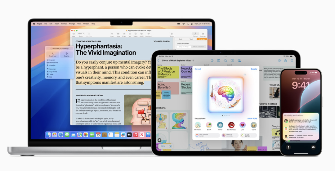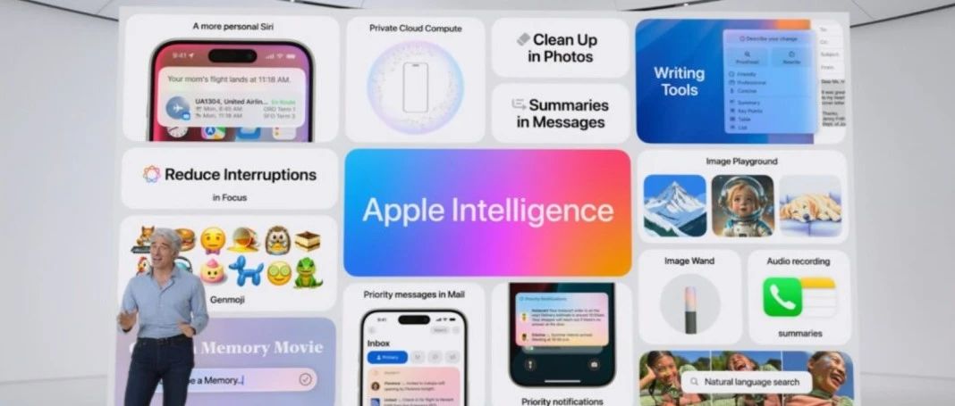 6 月 10 日,苹果在 WWDC2024 上正式发布 Apple Intelligence,定位为一款适用于 iPhone、iPad 和 Mac 的个人智能系统,它将生成模型的强大功能与个人背景相结合,提供非常有用且相关的智能。