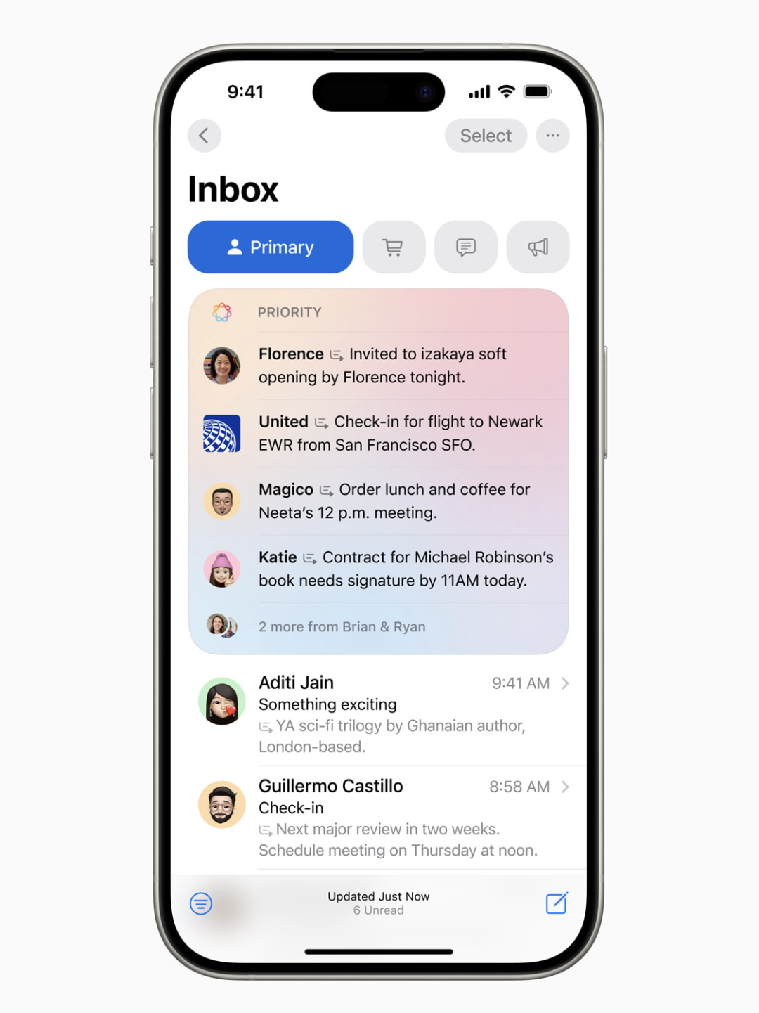 在收件箱中,用户无需打开邮件即可查看摘要,而不必预览每封电子邮件的前几行。