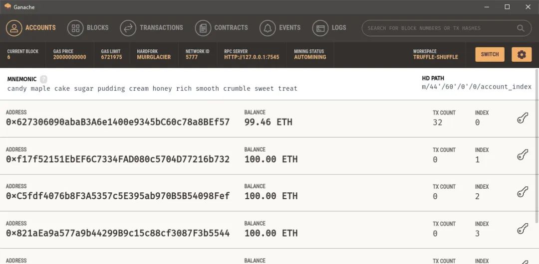 Ganache 工具拥有用户友好的界面,可以访问调试信息和区块链数据 (帐户、区块、交易)。我们还可以配置其他元素,如区块时间,以满足我们的开发需求。