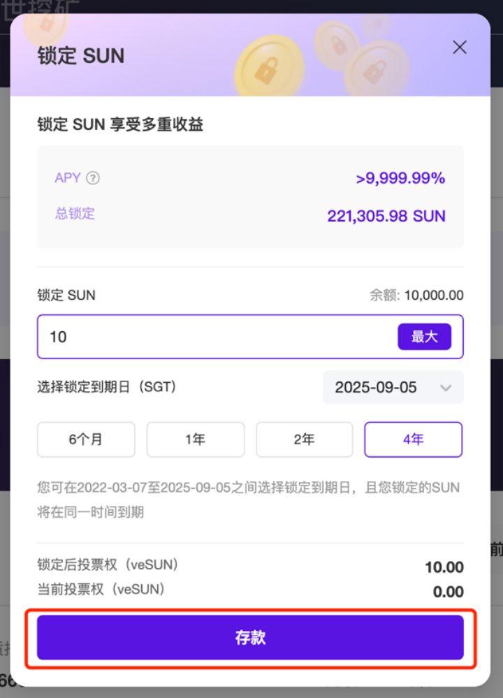 1.登陆 https://sun.io/?lang=zh-CN#/stake/two ,在「SUN 锁定」栏,点击「锁定获取 veSUN」,确认需锁定的数量、时间 后,点击「存款」按钮。解锁周期范围在 26 周(6 个月)至 4 年(365 天 *4)。所有锁定共用一个解锁时间,最多锁 4 年,所有锁定的 SUN 将在同一时间到期;同时,锁定 SUN 会获得 veSUN。