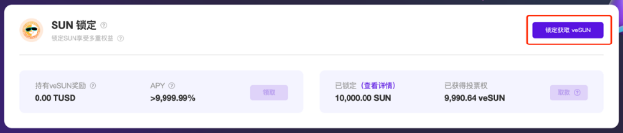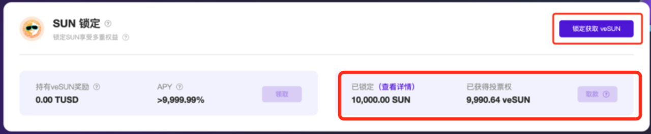 1.当您「锁定」SUN 后即可在页面中查看自己锁定的 SUN 数量及已获得的投票权。点击「查看详情」还可以查看锁定到期日期。