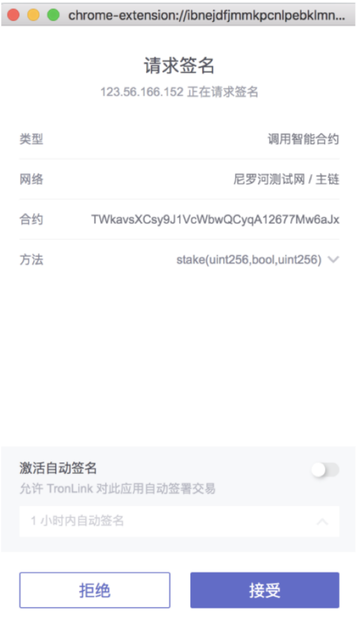 4.点击「投票」按钮后,请在 TronLink 请求签名弹框中点击「签名」按钮,确认投票操作