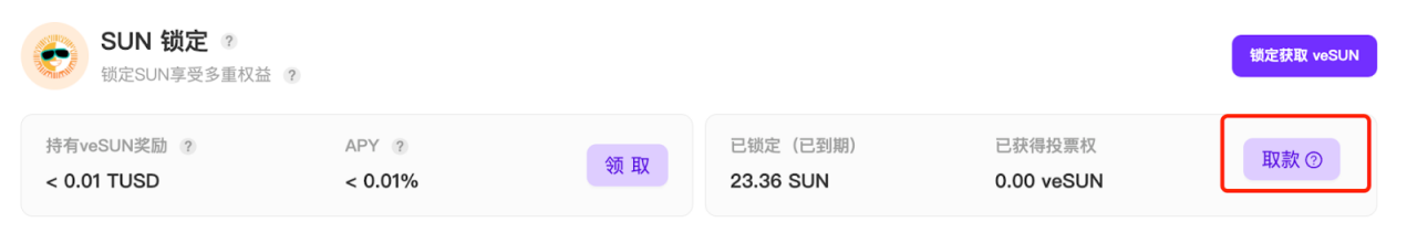 2.当您「锁定」的 SUN 到期后,即可点击「取款」以赎回 SUN。取回后相应的选票权则归零。