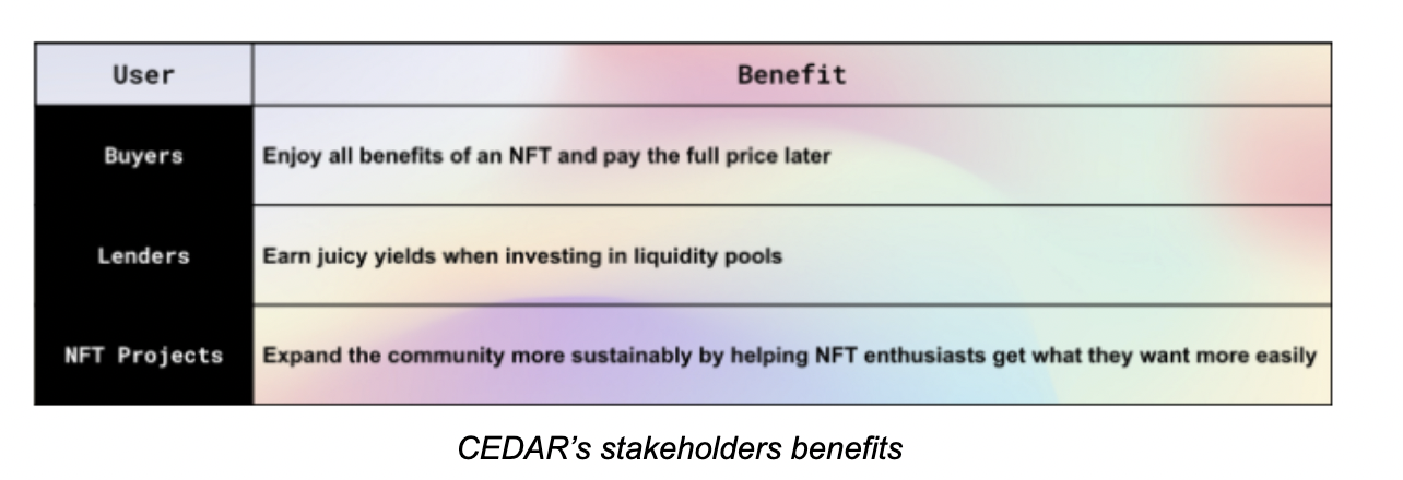 CEDAR is building a Buy NFT Pay Later protocol, which can truly help these NFT enthusiasts enjoy both the appreciation and utility of the NFTs. CEDAR lowers the barriers to entry to accessing NFTs and helps NFT lovers access the NFT they want at a more affordable price. CEDAR also helps NFT projects build and expand their community sustainably.