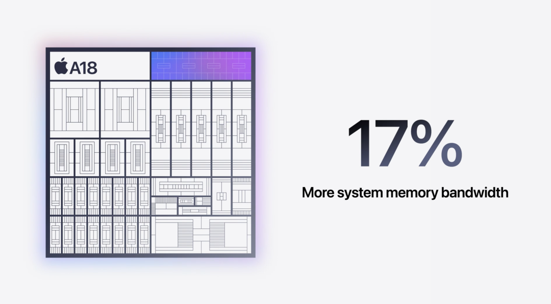 A18 Pro 具备 16 核心神经引擎,能够处理生成式 AI 工作负载,效率更高。同时,A18 Pro 还提升了系统内存带宽,确保图形性能与 AI 功能运行更加流畅。