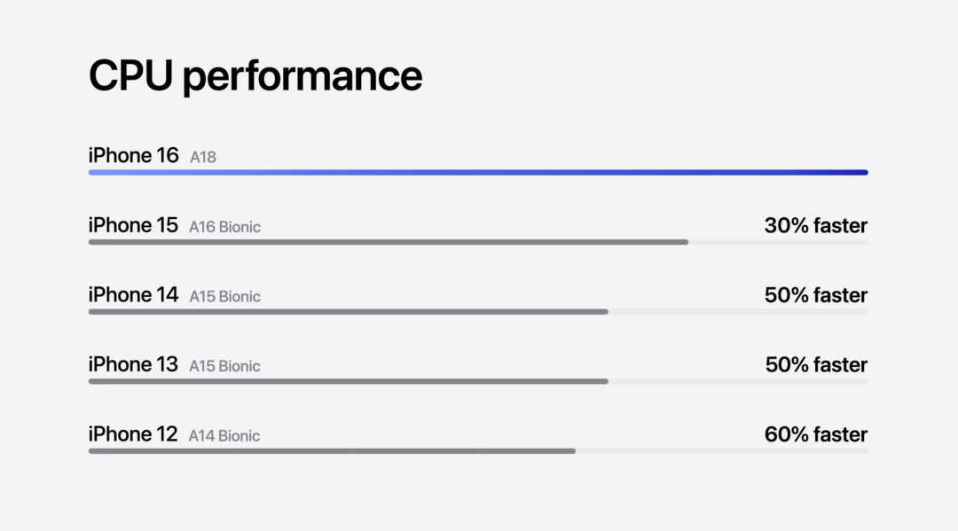 A18 采用第二代 3 纳米技术制造,晶体管更小、更快,且更节能。A18 搭载最新的 6 核 CPU,比 iPhone 15 处理器快 30%,比 iPhone 12 处理器快 60%。得益于最新的晶体管设计,CPU 在提供相同性能的情况下,能耗减少 30%。