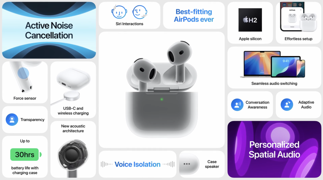 AirPods Series4 搭载了苹果 H2 芯片。音质方面显著提升,全新的声学架构带来了更饱满的低音和清晰的高音,是 AirPods 开放式设计中音质最出色的产品。