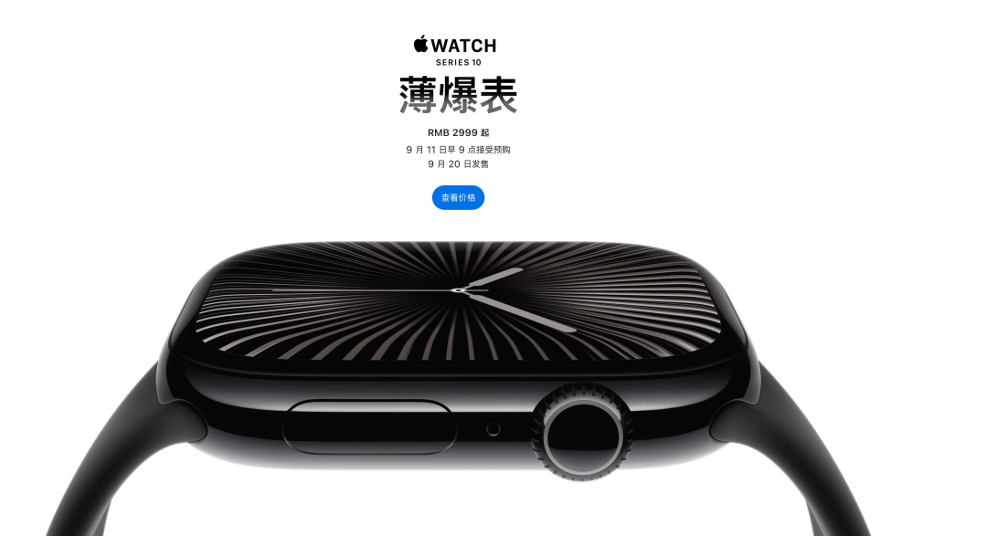 Apple Watch Series 10 国行起售价为 2999 元,现已开始接受预订,将于 9 月 20 日发售。同时发布的还有 Apple Watch Ultra 2,这款运动手表专为户外运动和极限环境设计,具有更强的 GPS 精度、深度计和电池续航能力,并首次引入了炫酷的哑光黑钛金属外壳。