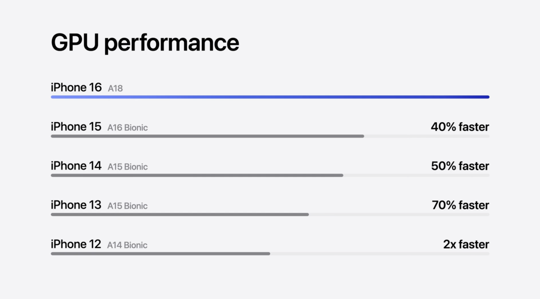 此外,A18 还具备最新的桌面级 GPU 架构,在处理游戏图形和智能功能时,性能比 iPhone 15 GPU 提升 40%,比 iPhone 12 GPU 快两倍,同时更为节能,提供相同性能时功耗降低 35%。