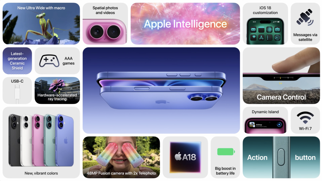 iPhone 16 不仅外观焕然一新,采用了 85% 回收材料制成的航空级铝合金外壳,推出了丰富的颜色选择,包括深海蓝、青绿色、粉色、白色和黑色,打造出大胆的新色彩组合。