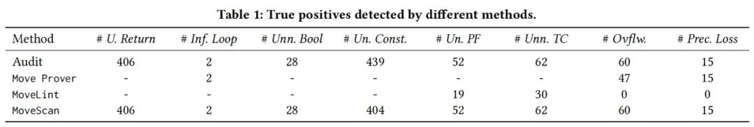 Move Prover 与 Move 语言一起发布,是由 Move 核心团队开发的形式验证工具。它通过规范提取、字节码编译和 SMT 公式生成的多步骤过程,根据形式化规范验证 Move 项目源代码,以便由 SMT 求解器进行验证。Move Prover 通过验证源代码是否符合形式化规范来识别缺陷,因此,除了源代码之外,还需要在源代码中编写相应的形式化规范,因此我们首先检查 ds1 中的合约是否已经包含开发人员编写的规范。如果存在相应的规范,我们可以重用它们,而不必从头开始编写它们。然而,统计显示只有 89 个(13.65%)合约包含规范,但不能直接用于检测定义的缺陷。因此我们使用 Move Prover 定义的 Move Specification Language (MSL) 为包含缺陷的合约编写规范,最终成功地针对 Inf. Loop、Ovflw. 、Prec. Loss 三种缺陷编写了规范。为评估 Move 的官方形式化验证工具 Move Prover 的有效性,我们对 ds1 中 283 个带有缺陷的合约进行了测试。表 1 的结果表明,Move Prover 仅能识别 6.02% 的缺陷(64/1,064),主要由于 Move Prover 是通过监测变量的状态变化进行验证,而其中的五类缺陷并不涉及变量的状态变化。此外,Move Prover 要求编写新的形式化规范语言,增加了使用难度,且仅支持源代码输入,无法单独分析合约。因此,由于需要人工干预、支持的缺陷类型数量有限、缺乏字节码支持以及需要完整的项目源代码,Move Prover 在识别缺陷方面存在局限性。MoveLint 是目前唯一可用的静态分析工具,它将源代码转换为 AST,并通过预定义的规则识别漏洞。我们将 MoveLint 应用于 ds1 的 652 个合约,结果显示其只能检测到 4.61% 的缺陷(49/1,064),在表 1 中,“-”表示 MoveLint 不支持的缺陷类型。除此之外依然存在许多漏报问题,归因于其依赖的编译器仅支持原生 Move,无法支持 Aptos 和 Sui 修改过的 Move,造成 ds1 中的 460 合约无法被 MoveLint 使用的原生编译器编译,导致其漏报率较高。同时,MoveLint 同样需要源代码支持,难以在大规模分析中广泛应用。如果排除无法编译的合约,召回率和 F1 分数将分别提高到 25% 和 38.89%。在性能方面,MoveLint 的时间开销在可以接受的范围内,每个项目平均需要 71.72 毫秒。因此,MoveLint 由于漏报率高、缺乏字节码支持以及需要完整的项目源代码,因此在缺陷识别方面效果不佳。