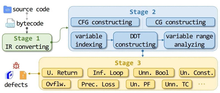 在上述背景下,MoveScan 框架被设计出来,用于满足自动化、字节码支持、更多缺陷类型支持以及高精度的需求,解决现有工具无法有效分析大规模 Move 合约缺陷的问题。MoveScan 通过三阶段流程实现对 Move 字节码的高效自动化分析:字节码转换为中间表示:MoveScan 将字节码转换为更适合元数据提取的中间表示,以此替代基于栈的操作码,将其转换为基于局部变量的操作。中间表示转换简化了元数据提取过程,为后续分析提供了基础。元数据收集:在中间表示的基础上,MoveScan 收集缺陷检测所需的元数据,包括控制流图(CFG)、调用图(CG)、数据依赖树(DDT)和变量范围约束。缺陷检测与扩展支持:MoveScan 使用八个内置检测器,通过预定义接口提取必要的元数据并识别缺陷。还为用户提供了开发新检测器的接口,平均仅需 96 行代码即可增加一个检测器,方便扩展以支持新的缺陷类型,提高适应性。通过这一设计,MoveScan 实现了对字节码的全面分析,能够自动检测多种缺陷,且具备灵活扩展性。为了评估 MoveScan 的准确率,我们使用 MoveScan 检测 ds1 中的 652 个合约,报告了 1,041 个缺陷。与人工审计到的 1,064 个缺陷相比,漏报仅 35 个(均为 Un. Const.,无安全风险),误报 12 个(均为 Ovflw.),MoveScan 的准确率、召回率和 f1 分数分别达到 98.85%、96.71% 和 97.77%。MoveScan 在检测效率上同样出色,单个合约平均分析时间仅 0.77 毫秒,且 90% 以上的合约分析时间低于 16.91 毫秒。在以项目为单位的分析中,MoveScan 的平均时间为 5.45 毫秒,仅为 MoveLint 的 7.6%。在链上数据集 ds2 的分析中,90% 的合约分析时间低于 3.01 毫秒,进一步展现了 MoveScan 的高效性。综上所述,MoveScan 在准确性、效率和适用性方面显著优于现有工具,为 Move 生态的安全性研究提供了重要支持。