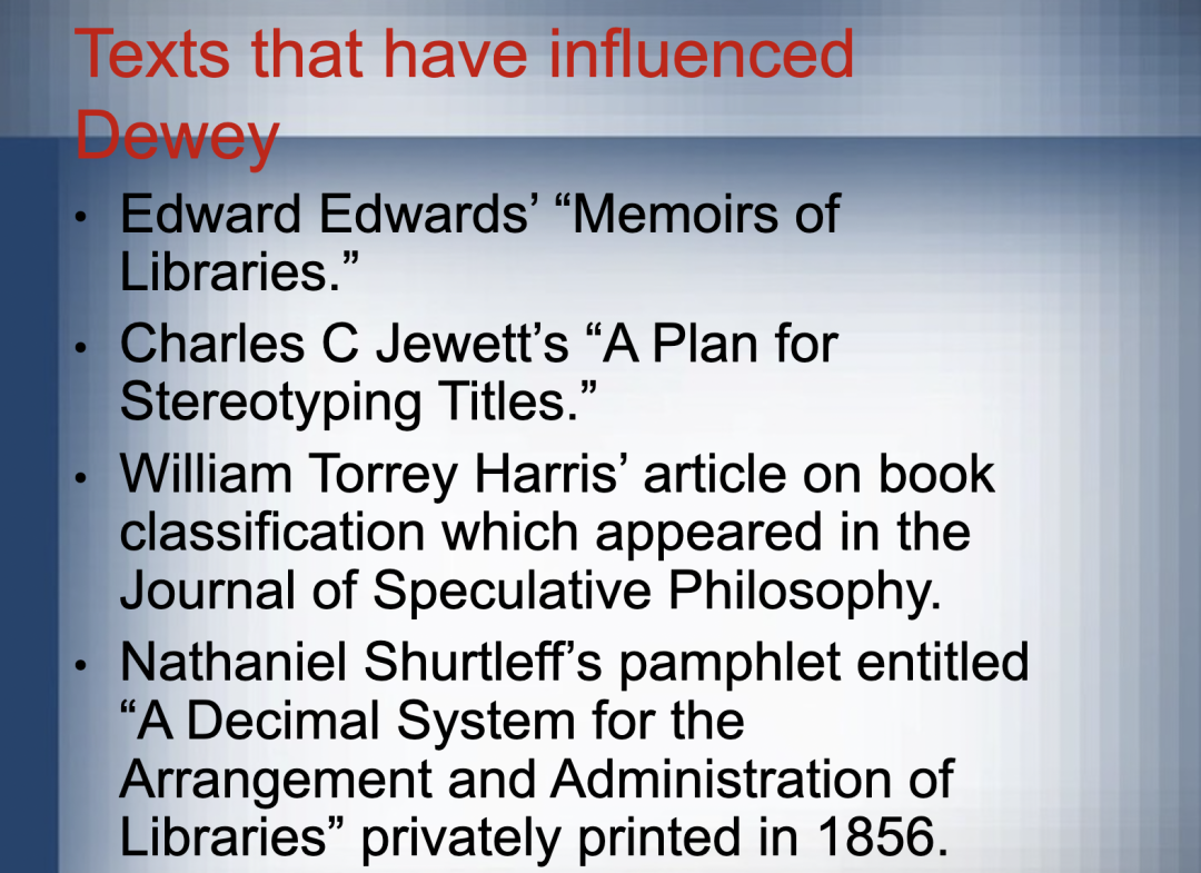 P124 [[威廉·托里·哈里斯]]的想法,不针对书籍本身,而是针对其包含的知识来分类。这种系统提供了一种关联分类法的方案,可以让人们根据书籍之间的联系寻找图书。哈里斯采纳了培根的三重知识理论,将书籍分为历史、诗歌、哲学三类。这种知识的分类法可以承受进一步的分析,以便建立起一套更详尽的知识结构来涵盖人类大脑的活动。