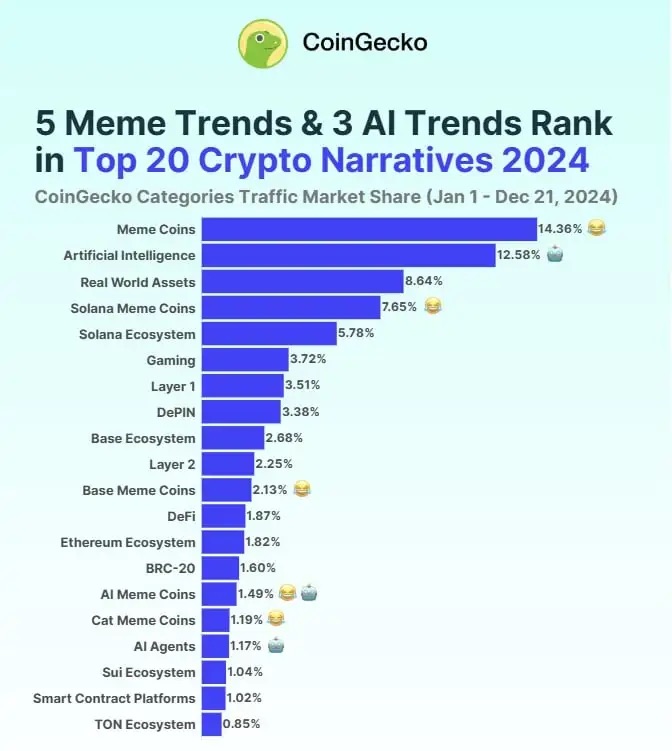 Coingecko 发布报告显示 2024 年的加密叙事呈现出多样化且快速变化的格局,其中 Meme 币和 AI 叙事成为最大的赢家。