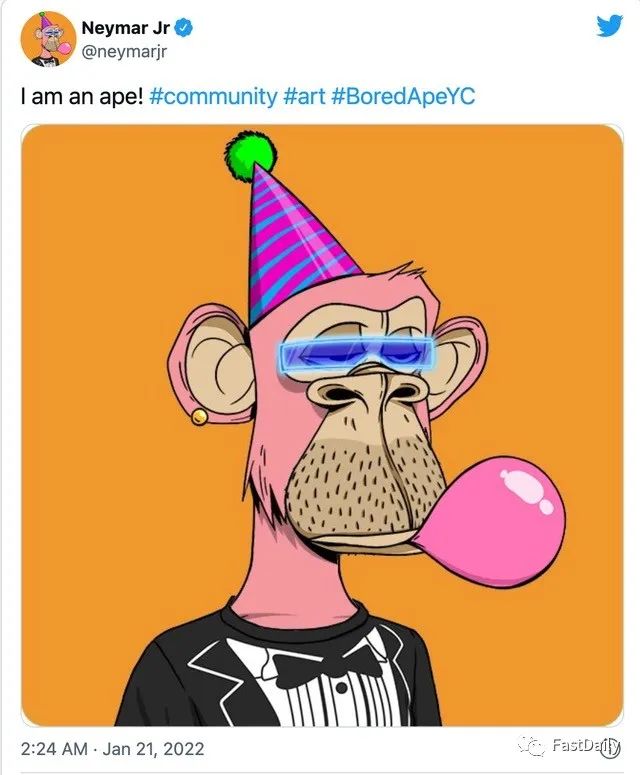 内马尔被广泛认为是世界上最优秀的足球运动员之一,他也是这份名单上 Twitter 粉丝最多的人。1 月 20 日,他以总价值超过 100 万美元的 ETH 购买了两只猿,大张旗鼓地进入了 Bored Ape Yacht Club。他用这只带着全息眼镜和派对帽、吹泡泡的粉红色 Bored Ape#6633 向他的 5500 万粉丝宣布了自己的存在,此外他还拥有激光眼的 #5269。