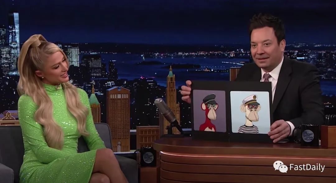 今年 1 月,希尔顿在《深夜秀》节目中展示了她通过 MoonPay 花 28.7 万美元购买的 Bored Ape #1294。「它们看起来可以成为朋友,」她拿法伦和自己的猿开玩笑说。