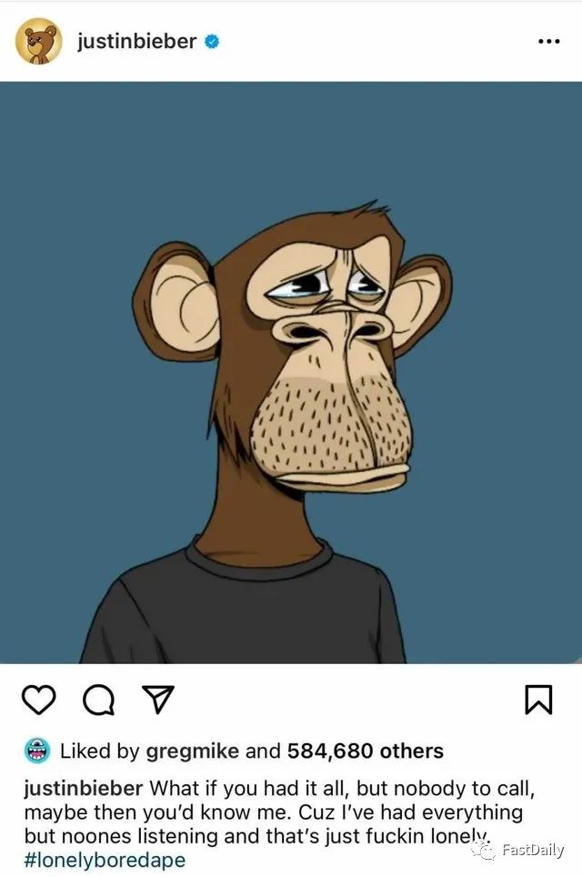 国际流行巨星 Justin Bieber 也以 500 ETH (约合 130 万美元) 的价格购入了 Bored Ape #3001。像 Gmoney 和 Farokh 这样的加密货币网红认为他付的价格过高,但也许比伯只是喜欢这个具有相对共同特征的猿的外观。比伯在整个推特上拥有第二多的粉丝,达 1.14 亿。他在 Instagram 上分享了这张照片,并引用了他的单曲 Lonely 中的歌词。他的钱包里还有来自 Doodles 和 World of Women 以及其他项目的 NFT。