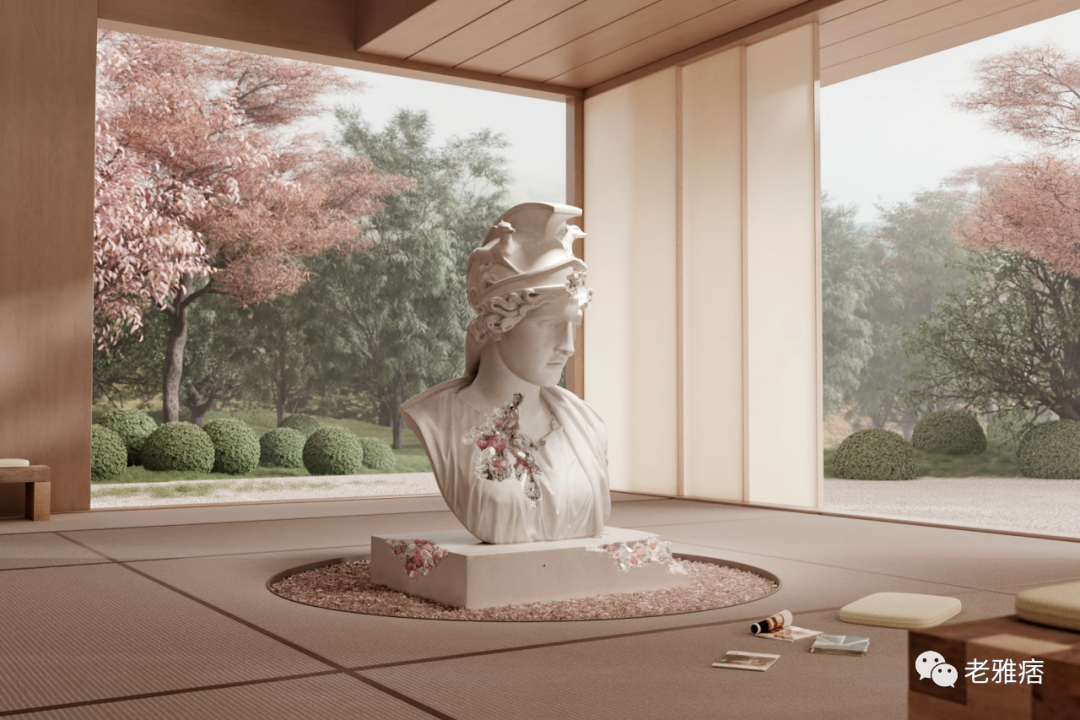 事实证明,这是虚拟世界战胜物质世界的胜利,即使它被包裹在一个繁茂的、有机的、物理现实的愿景中。这种虚拟的视觉流派越能发展其模拟世界的能力,它就越迷恋物质的奇观。也许这也是为什么许多模拟类型的比喻总是被“过去”的回忆所困扰。这方面的一个表现是,在艺术家的模拟世界中出现了奇怪的古罗马雕像,比如Daniel Arsham在NFT发行的视频《Eroding and Reforming Bust of Rome》(One Year)(2021),其中描绘了一个带头盔的古典半身像,背景可能是一个现代的日本室内,滑动的屏风门通往一个修剪整齐的花园。在一个小时的过程中,半身像慢慢地分解,露出嵌在白色雕塑材料中的水晶节点,然后这个过程逆转,半身像重新形成。