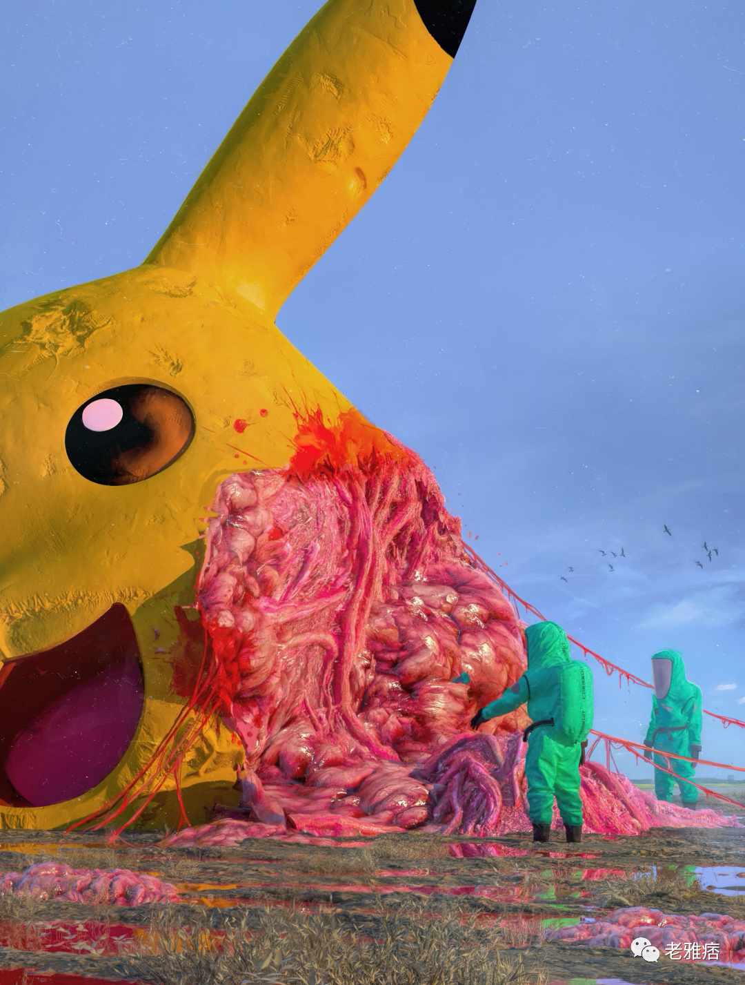 如果说Beeple的愚蠢有什么严肃的意义的话,那就是皮卡丘在这里被重新创造,就好像它是一个真正的、由肉和内脏组成的生物。具有讽刺意味的是,这种物质性不仅是Beeple的CGI渲染应用无技巧的产物,也是虚构世界和现实世界之间的界限被消除的产物。