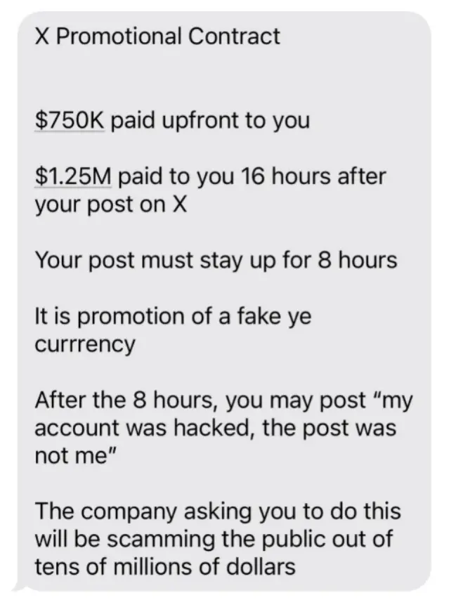 2 月 8 日,Kanye West 在 X 平台发文爆料,有人曾向他提出一项「合作」:以 200 万美元的报酬让他推广一个 Meme 币,并借此欺诈其粉丝社区。Kanye 断然拒绝,并晒出了聊天记录。